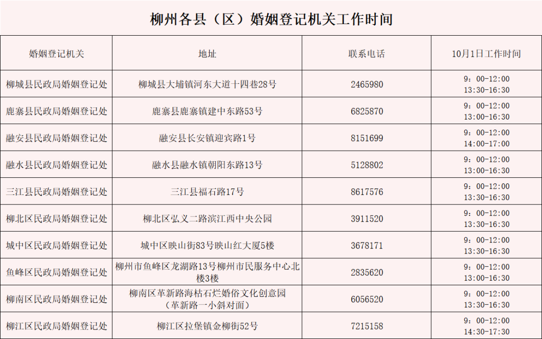 国庆节当天,柳州各县(区)民政局婚姻登记处服务时间如下: