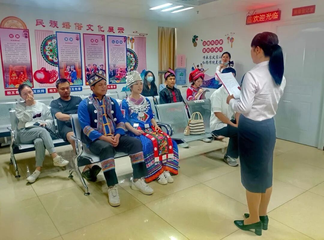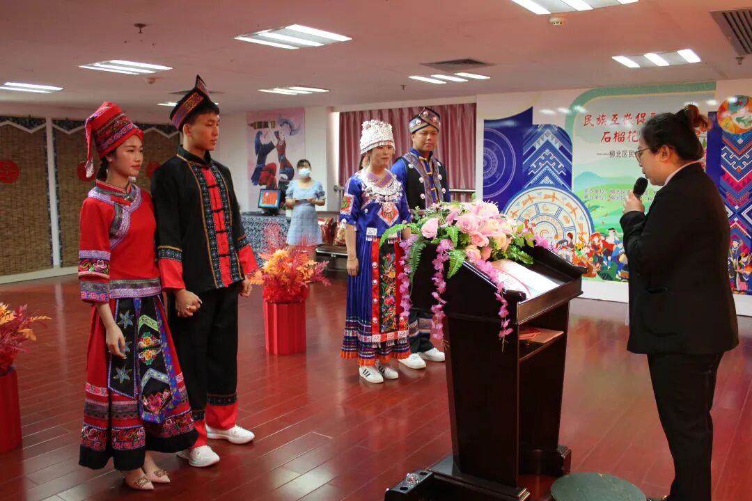 柳北区民政局婚姻登记处通过融合各民族婚俗服装和油茶等民族饮食文化等形式体现民族婚俗元素,开展主题为“民族互嵌促融合,石榴花开幸福家”的民族团结特色颁证仪式,新人身着少数民族服装,以少数民族传统歌曲为背景,在庄严的国徽下,在专职颁证员的带领下,宣读结婚誓言,颁发结婚证书,双方交换信物,最后一起共饮特色油茶,欢庆新人喜结连理。