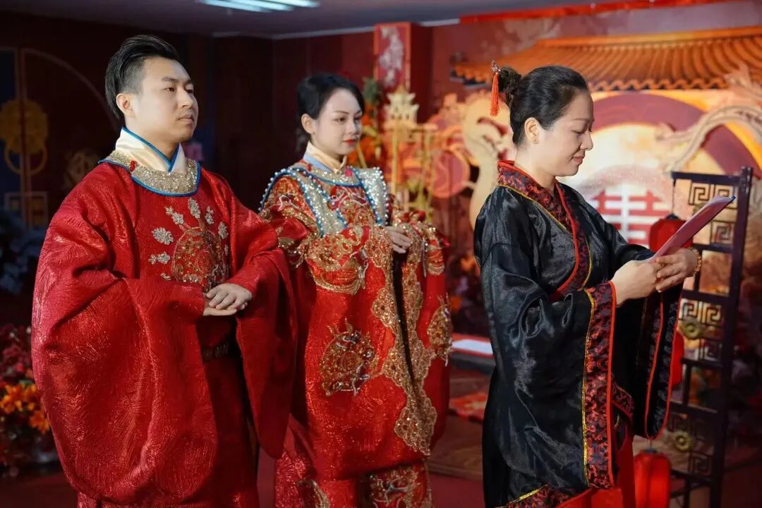柳州市城中区作为全国婚俗改革实验区,城中区民政局婚姻登记处融合中华传统文化,组织开展了主题为“龙凤呈祥,吾爱一生”的中华传统礼乐特色颁证仪式,在婚姻登记处颁证厅使用传统龙凤主题,男方身着传统龙纹婚服,女方凤冠霞帔,新人在传统与现代相结合的颁证仪式中,行揖礼与执手礼,共同宣誓,签婚书,领取结婚证。